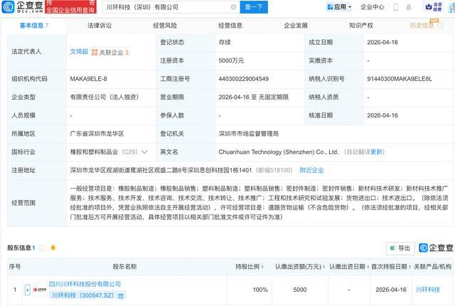 企查查APP显示,近日,川环科技(深圳)有限公司成立,注册资本5000万元,经营范围包含:塑料制品制造;塑料制品销售;密封件制造;密封件销售;新材料技术研发等。企查查股权穿透显示,该公司由川环科技(300547.SZ)全资持股。